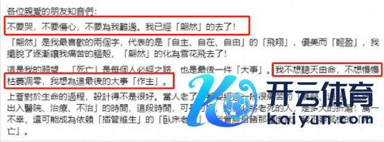 从曝出的遗言不丢脸出,琼瑶奶奶终身嗜好开脱与纵容,她不肯意靠近我方困窘地老去,但愿靠我方的形式体面地废除生命。